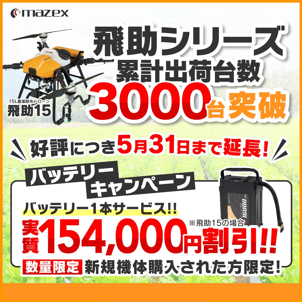 株式会社マゼックス(本社:大阪府東大阪市、代表取締役:吉野 弘晃、以下「マゼックス」)は、現在実施中の農業用ドローン向け「バッテリーキャンペーン」について、多くのお問い合わせとご好評を受け、実施期間を1カ月延長することをお知らせいたします。対象は新規機体をご購入いただいたお客様で、当初2026年4月30日までとしていたキャンペーン期間を、2026年5月31日まで延長いたします。