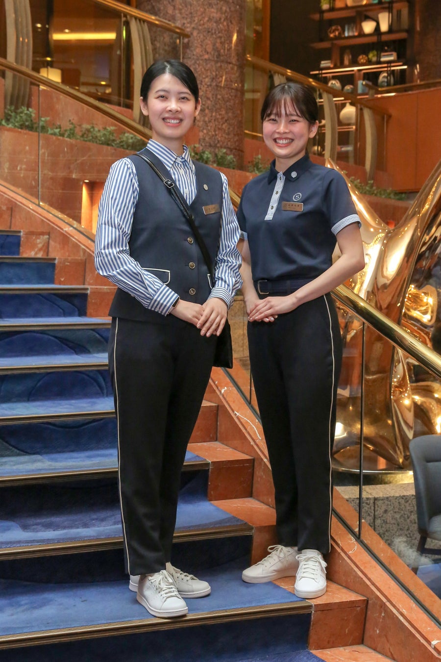 お客様のご案内や荷物のデリバリーなど、動きやすさを最も考慮したスタイリングを採用。シャツにベストというシンプルなスタイルながらも、ベストの背面には鮮やかなブルーを配色しスタイリッシュさを表現し、ロビーの中で映えるデザイン。動きやすく快適なスニーカーを採用。