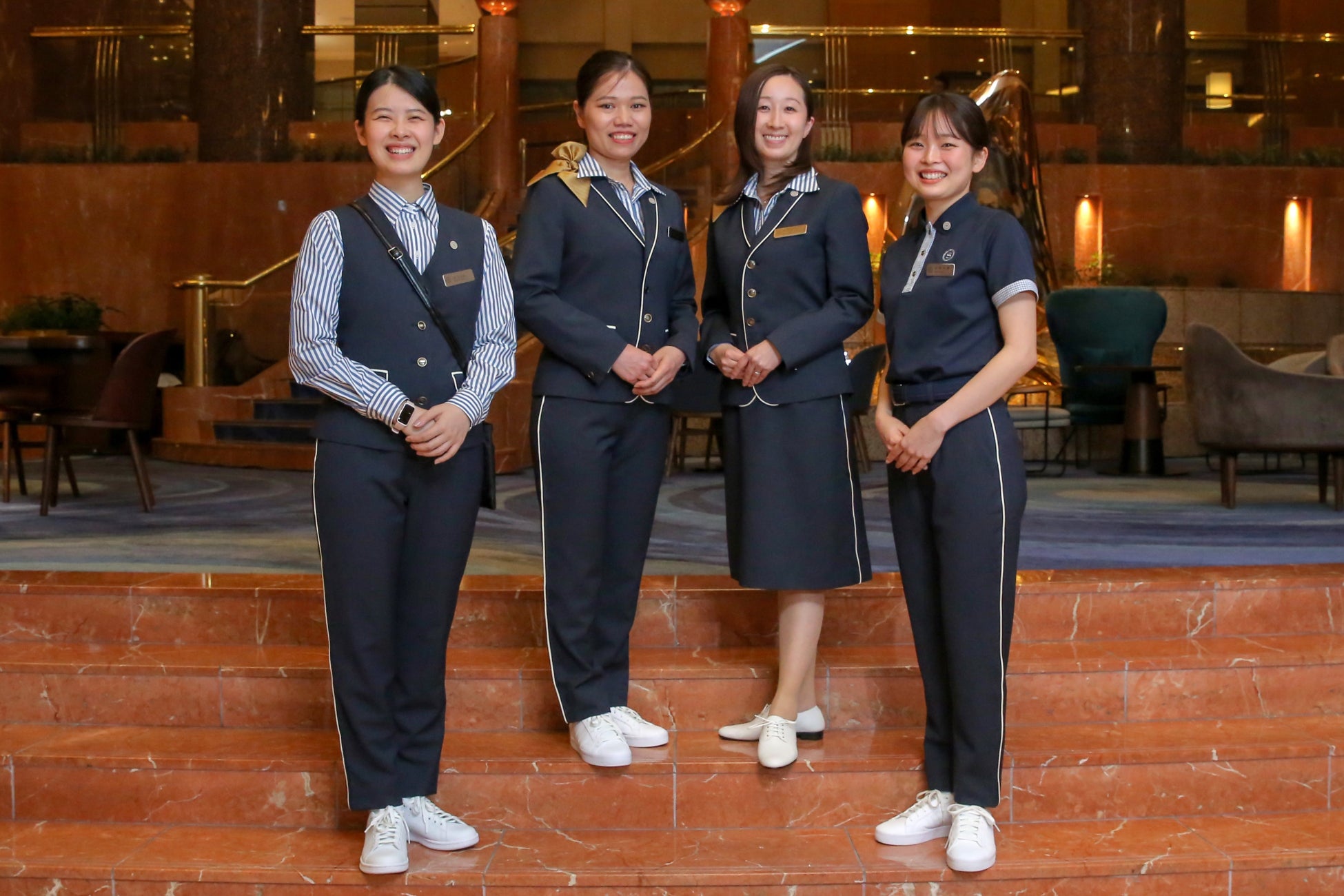 完成したユニフォームは、シェラトンブランドらしいスマートさやホテルの気品を大切にしたフォーマルな印象を表現しつつ、足元には新たな時代に順応したスタイリッシュさを感じさせるデザインに仕上がりました。