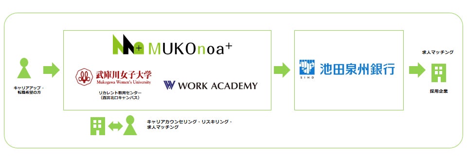 池田泉州銀行は、大阪・兵庫を地盤とする地域有数の金融機関で、取引先企業との強固なネットワークを有しておられます。また、2018年に金融機関の付随業務として取引先企業に対する人材紹介業務が認められたタイミングで、いち早く人材紹介事業に本格参入しておられます。経営幹部・管理職人材、グローバル人材に強みを持つ池田泉州銀行と、次代を担う若年層に強みを持つMUKOnoa+とが強力に連携していくことで、今後より幅広い中堅・中小企業の人材ニーズに応えていくことが可能になると考えております。