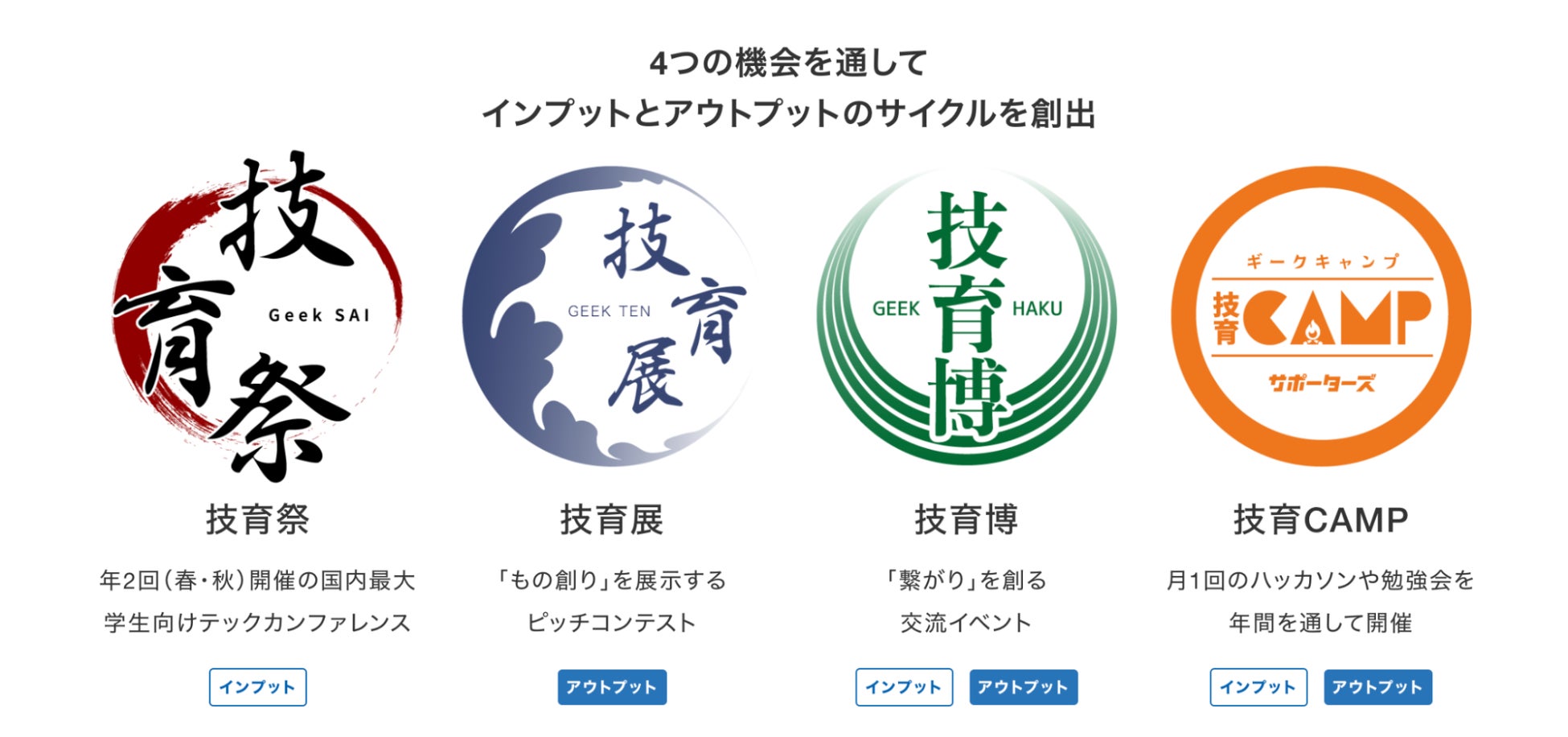 技育プロジェクトは、全国の学生を対象とした学年不問のエンジニアキャリア育成プログラムです。「自ら考え、自ら創る」エンジニアの育成を目指し、年間150回以上の勉強会やハッカソンなど、多彩で実践的なプログラムを展開しています。