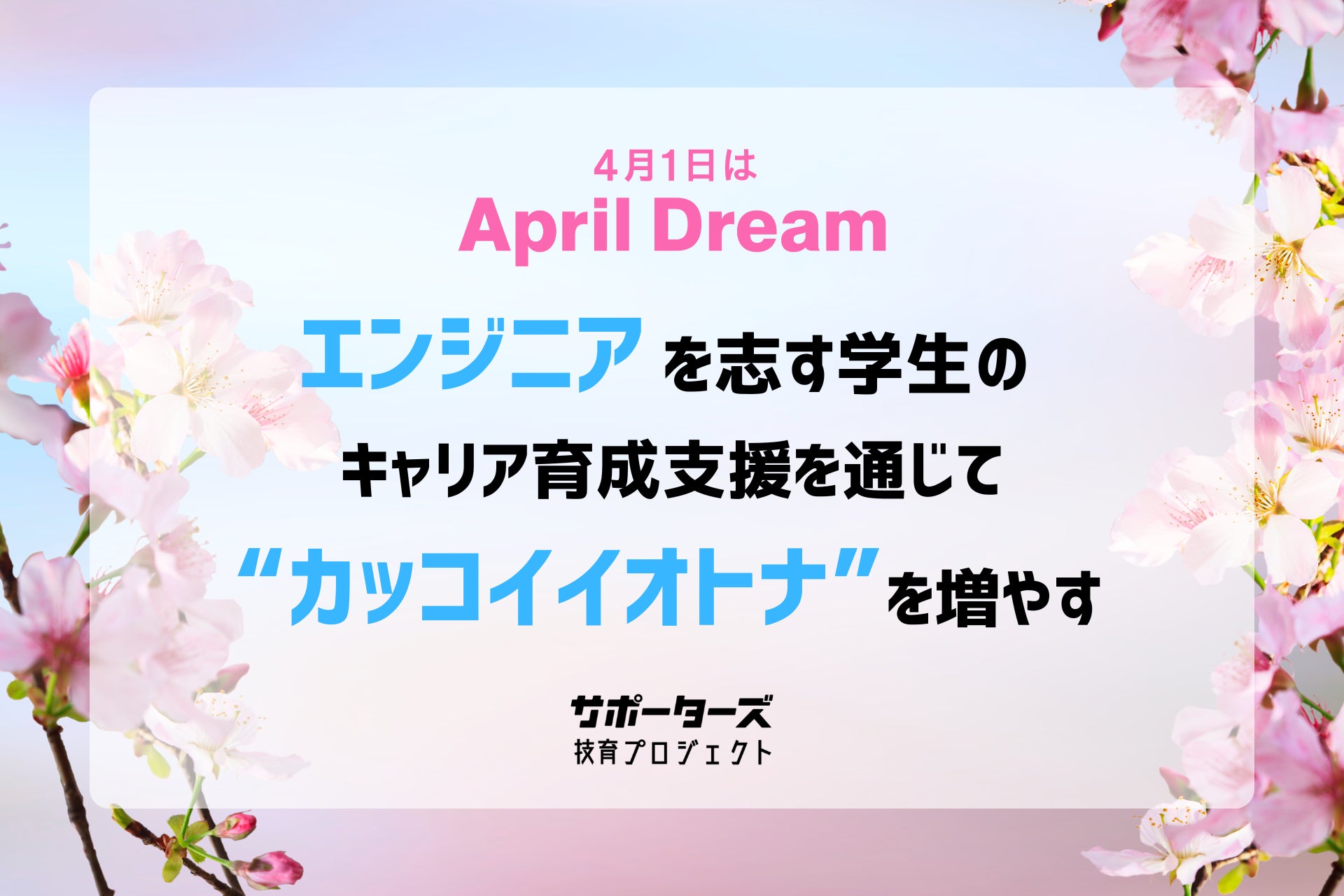 株式会社CARTA HOLDINGSのグループ会社で、国内最大級のエンジニア学生のデータベースを保有する株式会社サポーターズ(東京都港区、代表取締役:楓 博光、以下「サポーターズ」)は、4月1日を夢を発信する日にしようとするApril Dreamに賛同しています。このプレスリリースは「株式会社サポーターズ」の夢です。