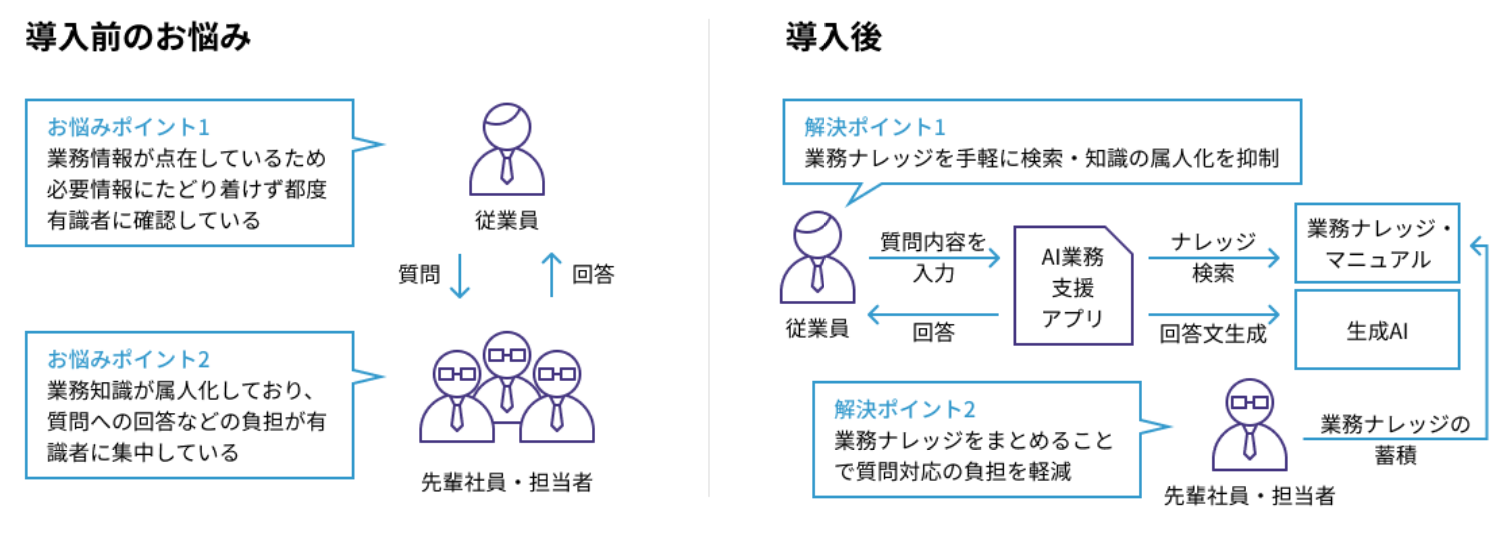 手続きや申請などの社内のナレッジ検索に時間がかかり、業務特有の知識が必要な作業(ドキュメント作成や資料作成)が属人化により従業員の作業コスト増大となっていた課題に対して、業務ナレッジ用に最適化されたAmazon Bedrockを利用することで社内ナレッジを手軽に検索・回答できる生成AIシステムを構築しました。