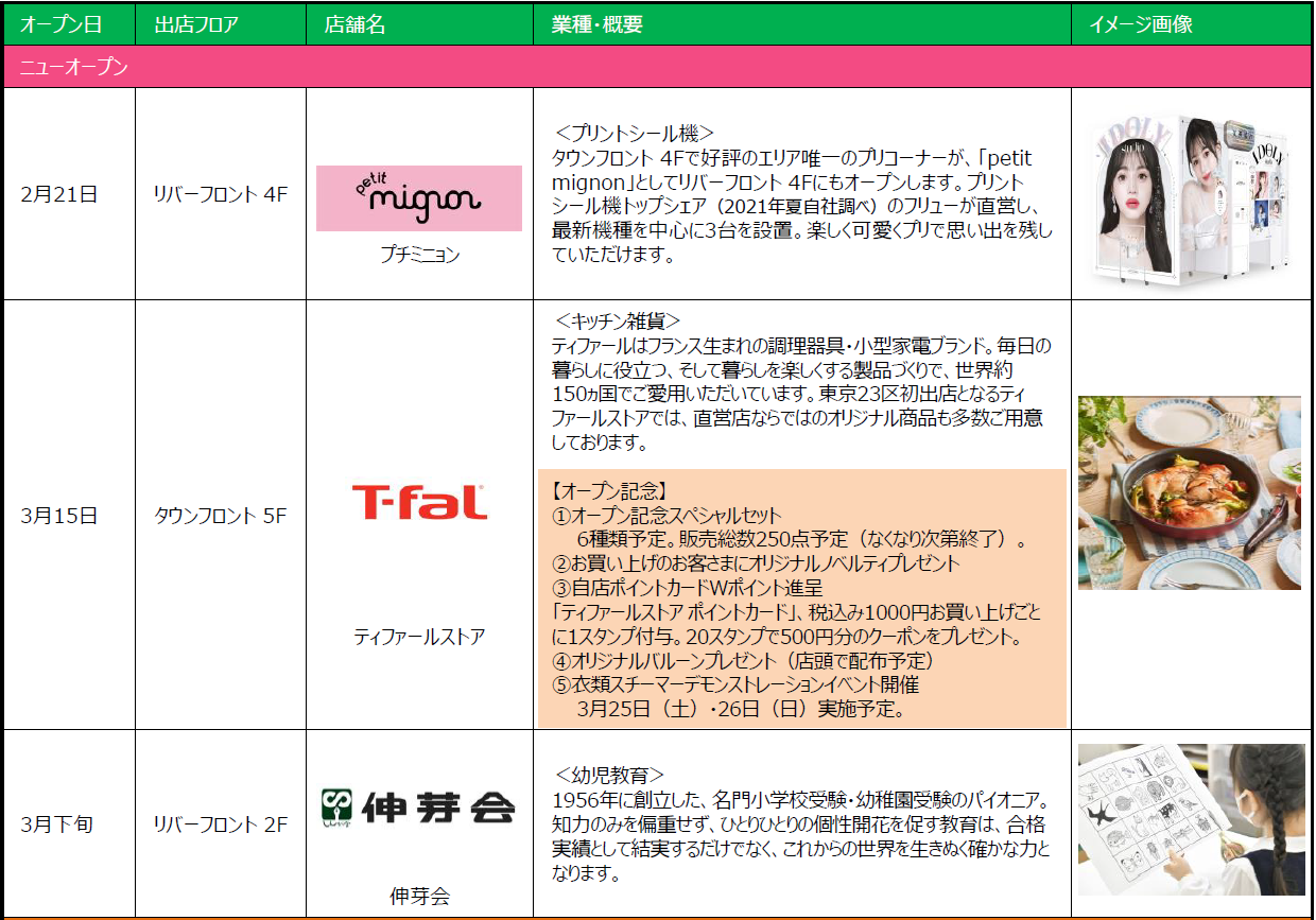東京23区初出店となる「ティファールストア」をはじめ、新規出店3店舗・期間限定2店舗・リニューアル4店舗が登場。お得なオープン記念商品やプレゼントも。