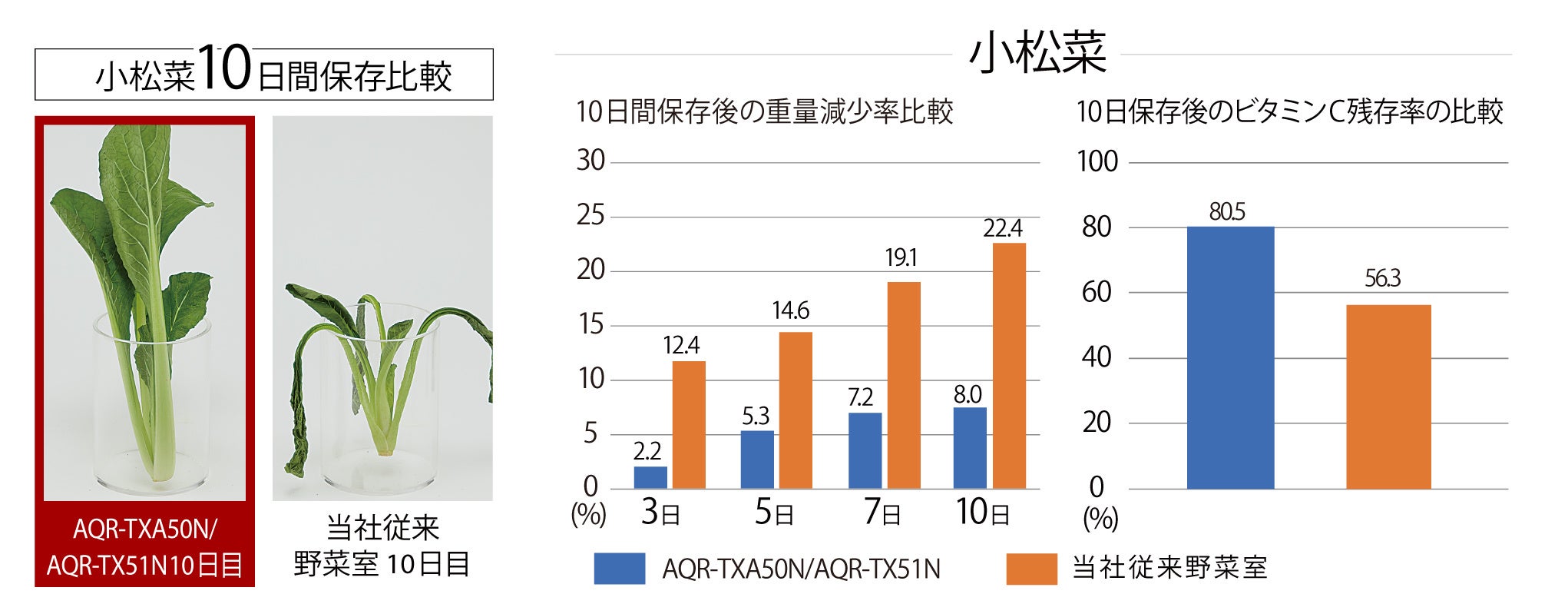 ※3:試験条件/ AQR-TX51NとAQR-SV38K(2021年モデル)を各1台用意し、AQR-TX51Nの野菜室(うるおいエリア)を試験区、AQR-SV38Kの野菜室を対照区として約1.8kgの野菜をラップなし、ドア開閉なし、ツインLEDオフで保存しました。保存期間を10日間とし、保存前および保存後にそれぞれの項目を評価しました。小松菜の保存後の重量減少率はAQR-SV38K 22.4%、AQR-TX51N 8.0%。保存後のビタミンC残存率AQR-SV38K 56.3%、AQR-TX51N 80.5%。運転状況や食品の種類、状態や量により、効果は異なります。当社調べ。