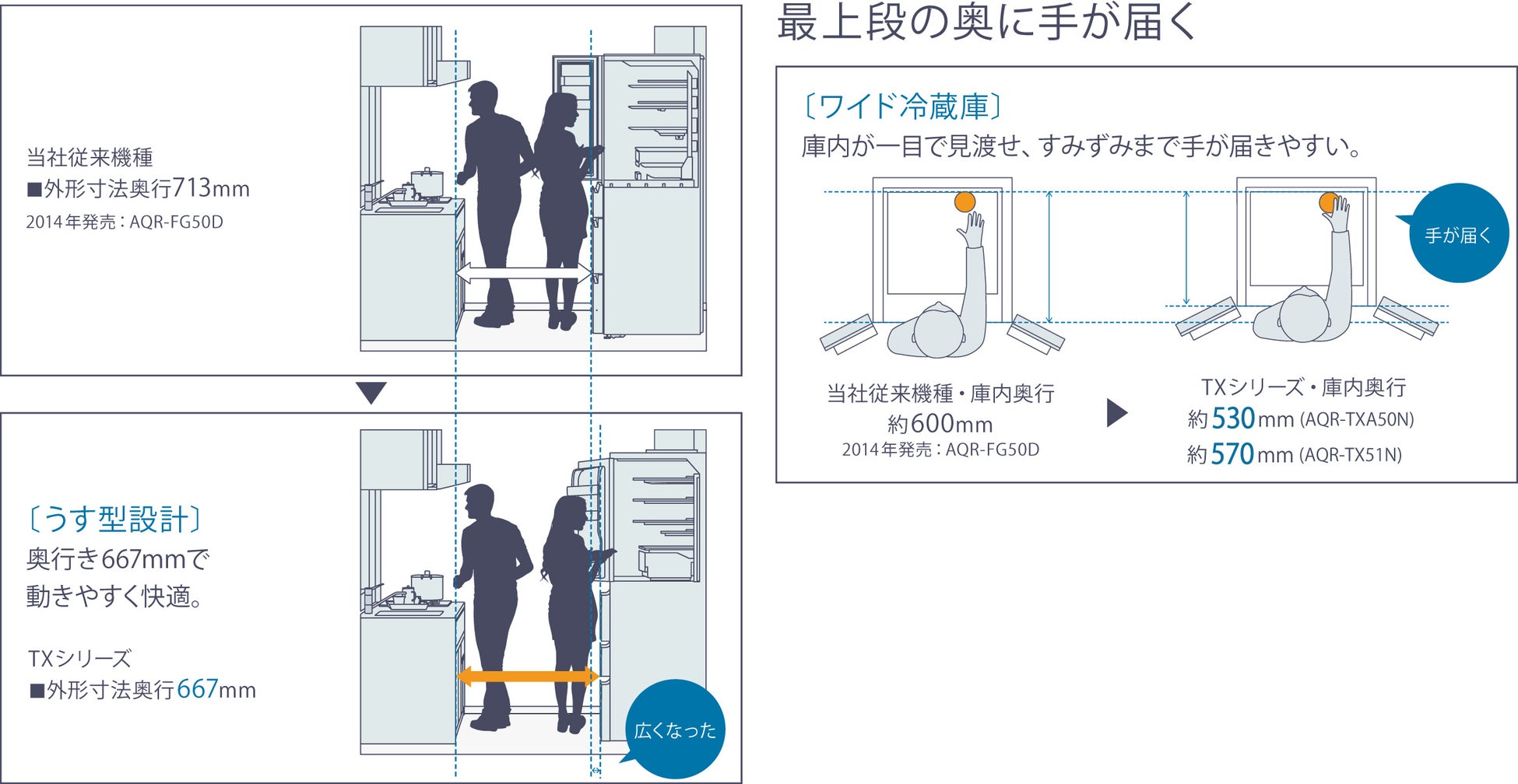 冷蔵室最上段の奥まで手が届きやすく、キッチンカウンターと面を揃えやすい薄型設計です。取り残しがちな、奥にしまった食材も取り出しやすくなり使い勝手が向上するだけでなく、キッチンのスペースが広く使えます。