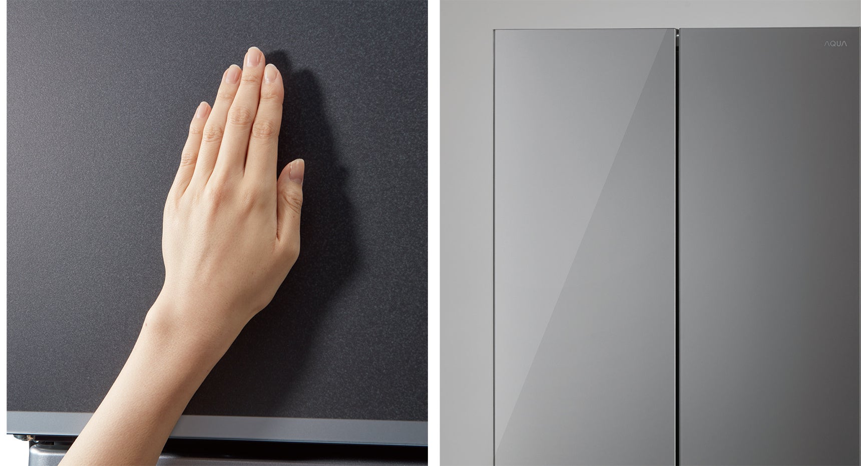 また、外観デザインは空間との調和をテーマとし、周囲になじむ落ち着いた色調やシンプルな形状を採用。冷蔵庫の印象を決める扉は上質さを追求し、壁紙になじむマットな質感にしました。AQR-TXA50Nの冷蔵室扉に搭載したLEDステータスバーは、冷蔵庫に近づくと運転状況を7色の柔らかな光でお知らせし、空間にさりげなく彩りを添えます。