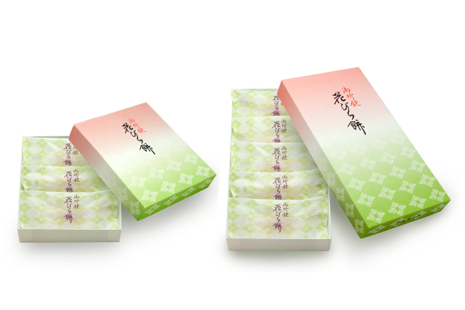 「御所鏡」おひとつずつを取扱いやすい個包装の袋にくるみ、5個入・3個入の箱入りに仕上げました。(3個入は店頭販売のみ)外装には縁起の良い松菱(まつびし)の文様をあしらった、おめでたい意匠となっております。