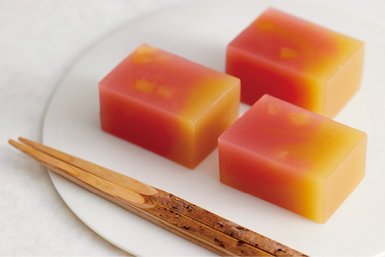 朱色と黃色の「染め分け羊羹」。あっさりとした甘さのきめ細やかな羊羹にほくほくの刻み栗をこめた、素材の味と伝統の技が光る美味しさです。卯年の吉祥をことほぐ、新春の祝菓をどうぞ。