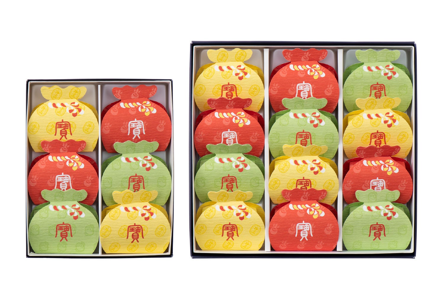 宝物の袋をかたどったパッケージひとつに、焼菓子がひとつ入っております。お詰合せへも対応しておりますので、年末年始の贈りものにぴったりなお菓子でございます。