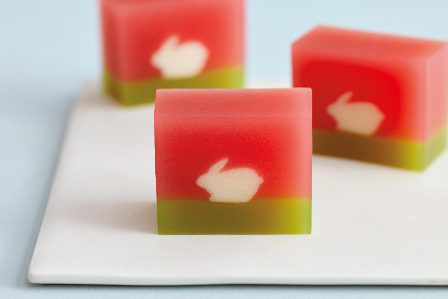 コントラストの美しい二層の羊羹に、くっきり浮かぶうさぎのすがた。新年の開運招福の願いをこめました。どこを切っても、同じ意匠の出てくる羊羹。紅と緑の美しい断面に、白い「卯」の意匠が現れます。