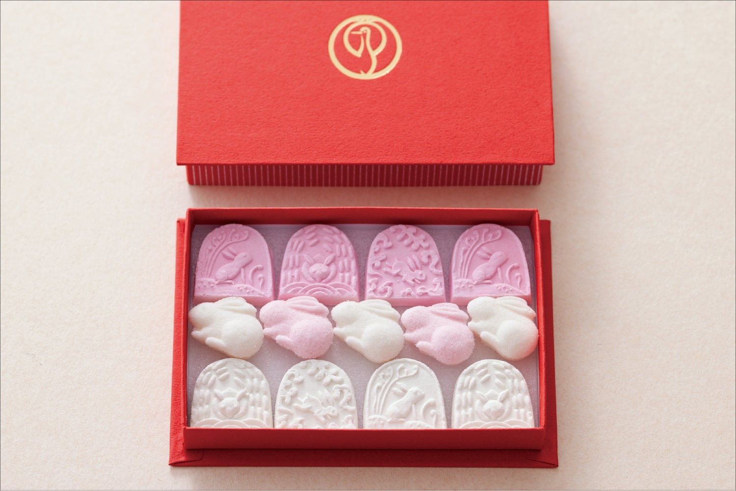 赤に金の鶴丸を箔押しした小箱には、干支「卯」をあしらったイラストカードを添えました。職人がひとつひとつ打ち出しておつくりした可愛らしい落雁は、見ても食べてもお楽しみいただけます。