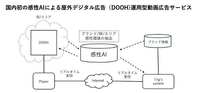 『Trig’s』とは、インターネット上のコンテンツの閲覧データを基にターゲットの感性価値をAIで分析し、広告商材の感性価値とマッチングさせるPMP※広告サービスです。本サービスをDOOH領域にも導入し視認者の感性データを活用することで、デジタル(PMP広告)とリアル(DOOH)を組み合わせた広告配信を実現します。