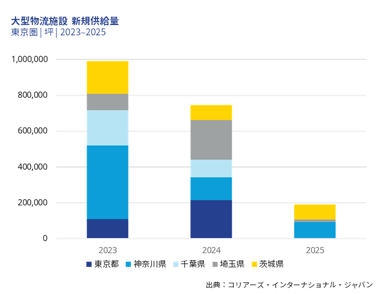 大手総合不動産プロフェッショナルサービス・投資運用会社であるコリアーズ・インターナショナル・ジャパン株式会社(代表:小笠原 行洋、本社:東京都千代田区、NASDAQおよびTSX:CIGI、以下コリアーズ・ジャパン)は、本日、「大型物流施設 2023~2025年の新規供給の見通し|東京圏」を発表しました。当レポートは、コリアーズ・ジャパンが、東京圏(一都三県および茨城県の一部)の延床面積が概ね5,000坪以上の、主に賃貸に供される物流施設の新規供給量の今後の見通しについて、独自に収集したデータに基づいて分析したものです。