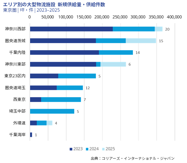2023年~2025年の東京圏(一都三県および茨城県の一部)における大型物流施設の新規供給は、2023年に過去最大規模の供給量になることが見込まれ、賃料水準や空室率に影響を及ぼす可能性があります。