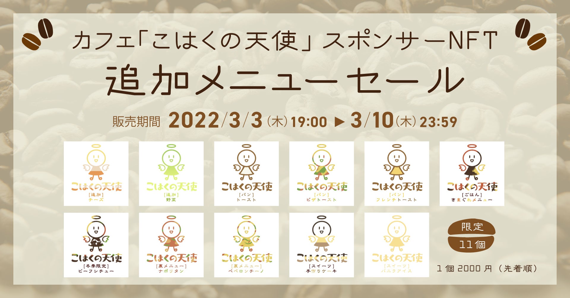 2/18に実施されたカフェ「こはくの天使」のメニュースポンサーNFTは、発売開始2分ですべて完売しました。今回は、第二弾として追加メニューのスポンサーNFTを3/3 19時から販売します。