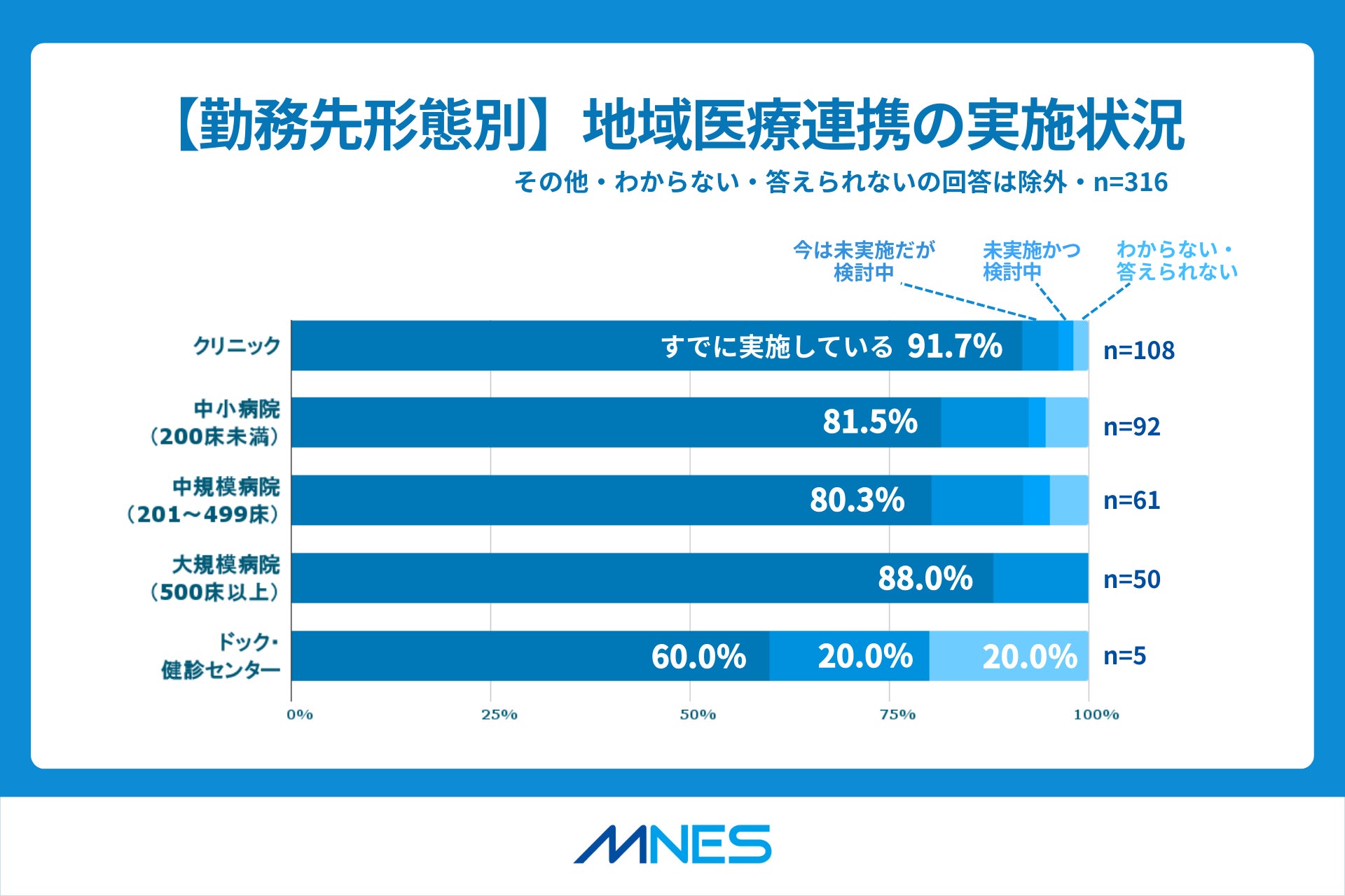 ⚫︎地域医療連携の実施率は全体の85.5%と高水準。特にクリニックの実施率は、91.7%にのぼりました
