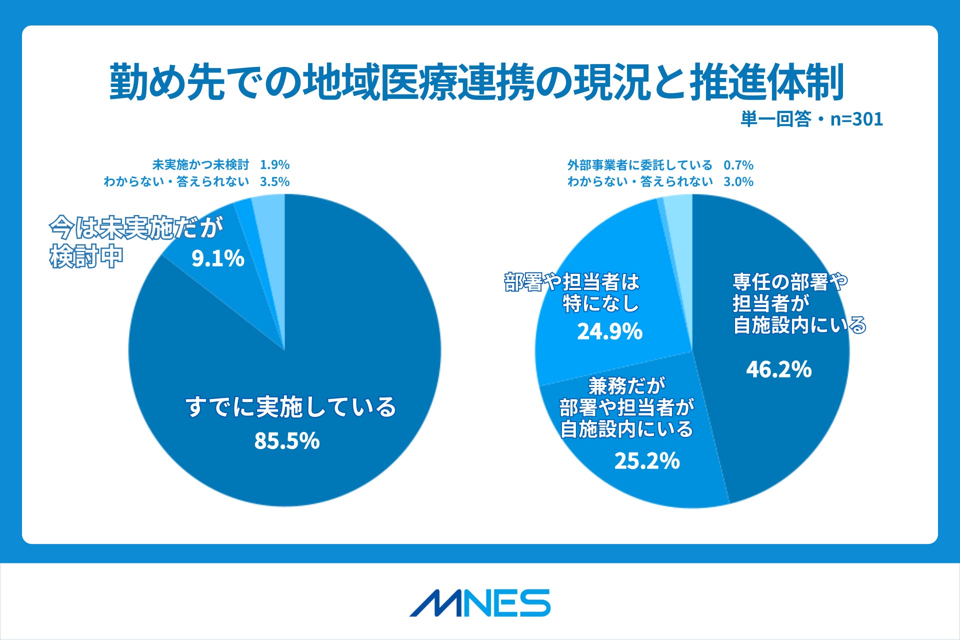 勤め先の医療機関での地域医療連携の現況を質問したところ、全体では85.5%がすでに地域医療連携を実施済みと回答しました。さらに、地域医療連携を推進するための体制について最も当てはまるものをあわせて質問したところ、約半数が専任の部署や担当者が自施設内にいると回答する結果となりました。
