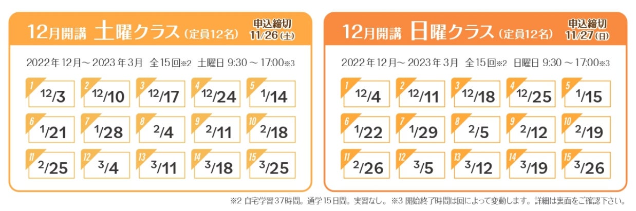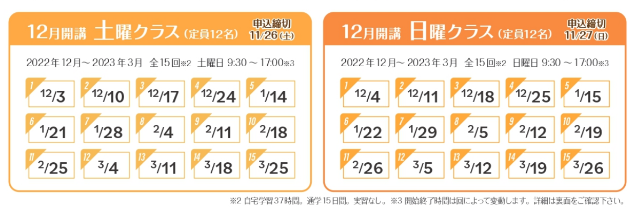 12月開講「土曜クラス」・・・12/3~3/25 ★申込締切:11/26★