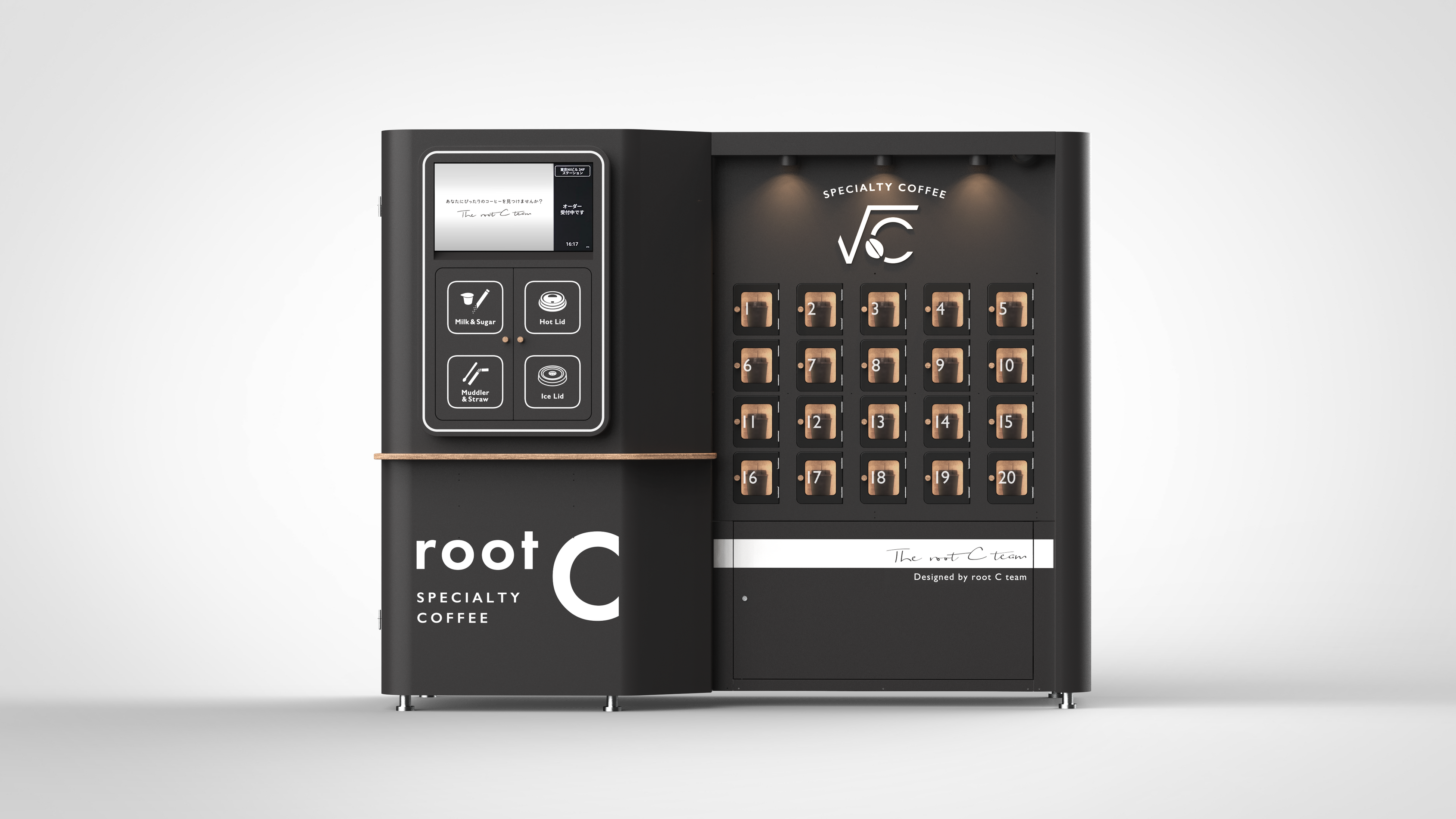 2021年4月に正式リリースした自社プロダクト「root C」は、アプリから時間を指定して注文することで、お客さまの受け取りたい時間に合わせて挽きたて、淹れたてのスペシャルティコーヒーを専用のロッカーから提供する、完全無人営業のコーヒースタンドです。