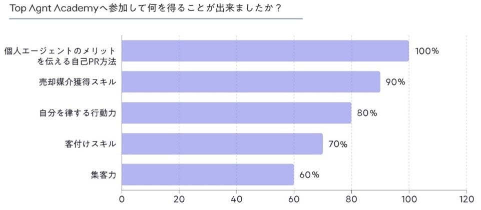 また、受講生に聴取したアンケートでは参加者の多くが新たなスキルセットの獲得を実感することや、個人として活動するエージェントにとって貴重な横のつながりを得ることができたとの感想が多く、定量的・定性的な点両面での受講メリットを感じています。