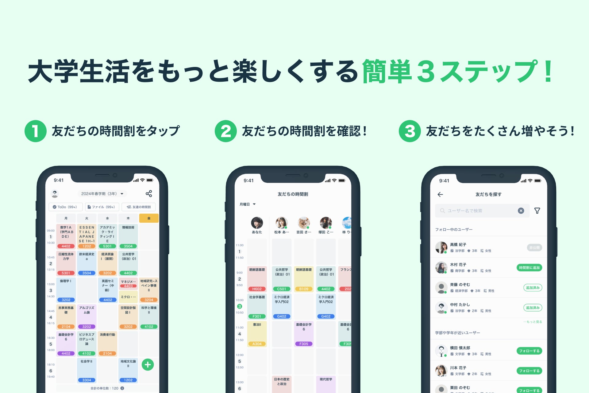 春は多くの大学生にとって新生活のスタートとなる時期です。新しい環境に適応しながら、同級生と友人関係を築くことは、充実した大学生活を送るうえで欠かせません。「友だちと時間割比較機能」は、そのような新入生の皆さまの新生活を応援します。