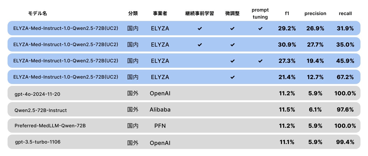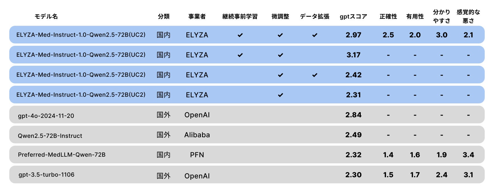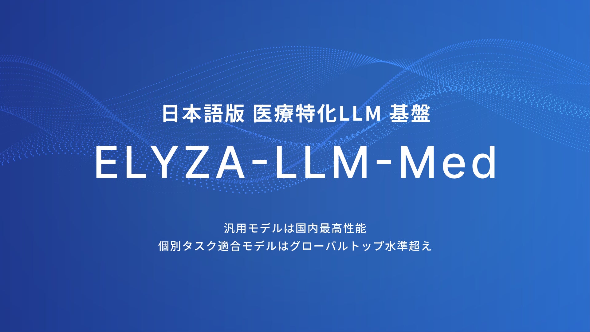 大規模言語モデル(LLM)の社会実装を進める株式会社ELYZA(代表取締役:曽根岡侑也、以下当社)は、内閣府が設置した「戦略的イノベーション創造プログラム(SIP:エスアイピー)」(※1)が公募したSIP第3期補正予算「統合型ヘルスケアシステムの構築における生成AIの活用」(※2)のうち、テーマ1「医療LLM基盤の研究開発・実装」における研究開発課題「日本語版医療LLMの開発ならびに臨床現場における社会実装検証」にて、医療領域における国産の特化LLM基盤の開発を担いました。本研究において構築した日本語版医療LLM「ELYZA-LLM-Med」シリーズは、総合点で国内最高性能を達成、現場の医療タスクにおいてはグローバルトップ水準を超える精度を実現しています。また、今回の特化LLM基盤開発において使用し、有効性を検証したアプローチは、特定の領域における特化モデル開発において汎用性の高いアプローチであり、多くの領域で横展開が可能と考えております。