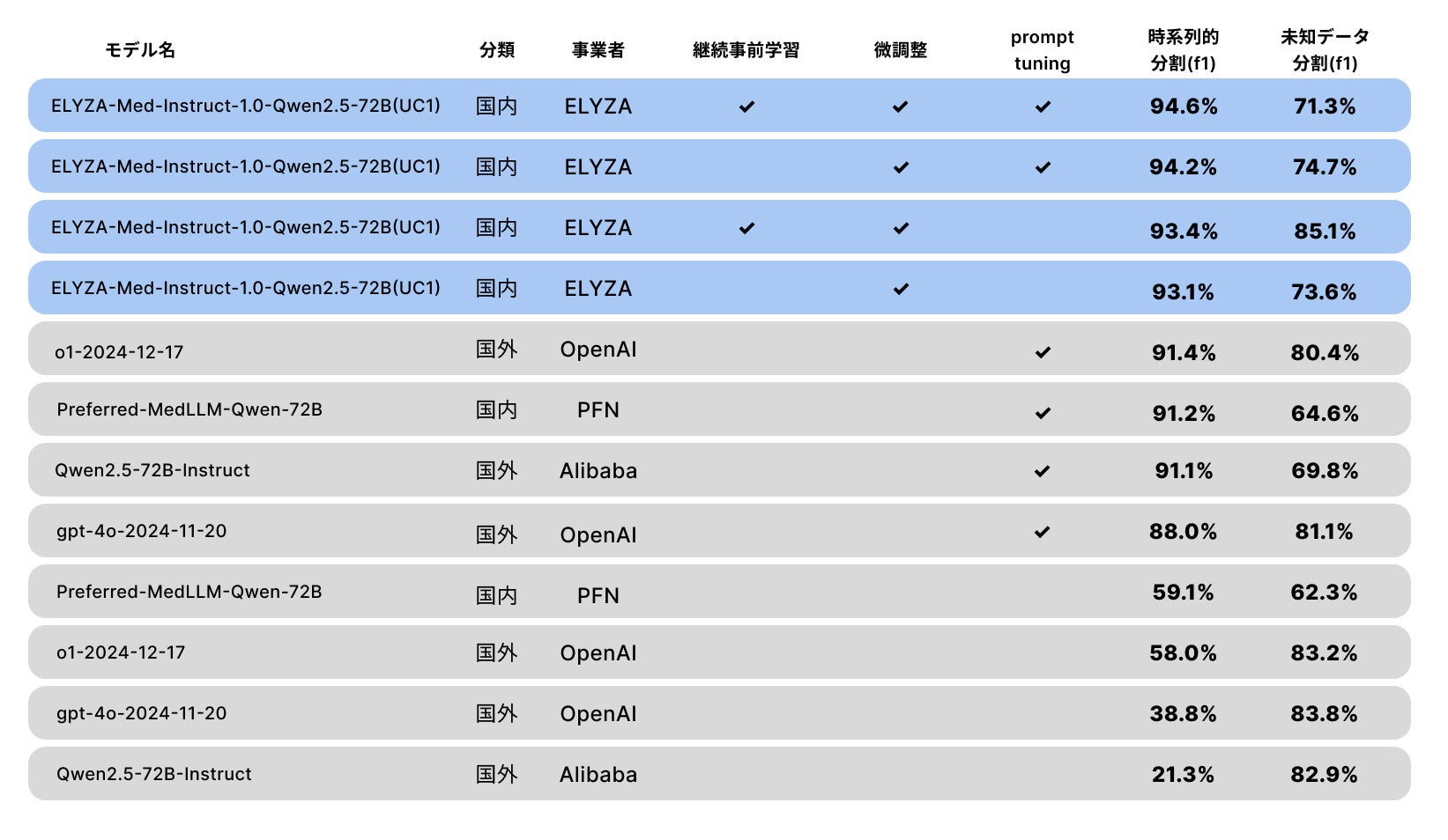 医師国家試験ベンチマーク「IgakuQA」(※3)において、「ELYZA-Med-Base-1.0-Qwen2.5-72B」は国内最高性能を達成しました。