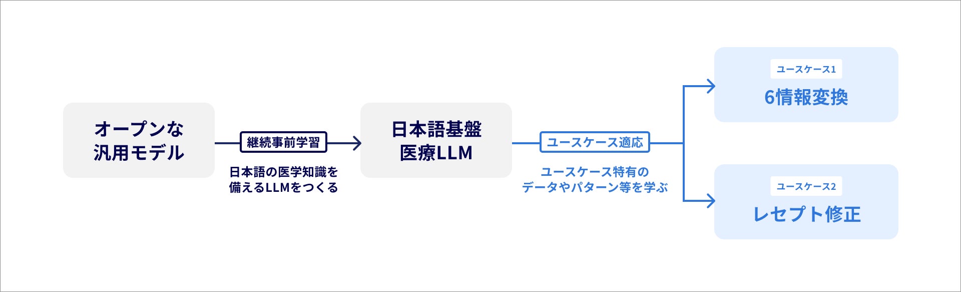 開発にあたっては、今後の医療DXを牽引していく技術基盤として、より多くのユースケースに対応すべく、まず根幹となる日本語版汎用医療LLMを開発し、それをベースに各ユースケースへ適合させるアプローチを取りました。(図1)