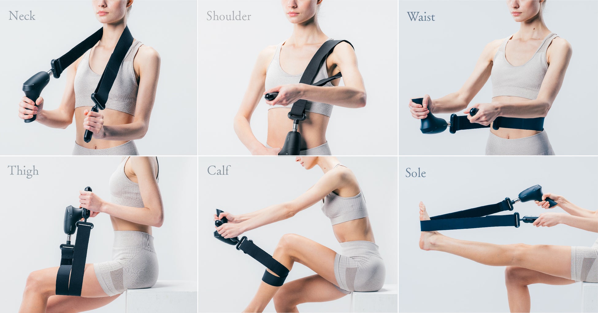 「RELEASE BELT」を身体に巻くように使うことで、首、肩、腰、さらには下半身と、さまざまな部位の筋肉を心地よく刺激します。もちろん手が届きにくい背中も、当てる方向を変えることによって全方向に広範囲のケアができます。