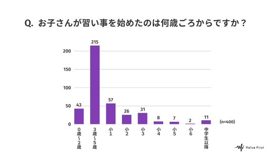 「お子さんが習い事を始めたのは何歳ごろからですか?」という質問に対し、回答者の5割以上が「3歳〜5歳」と回答しました。