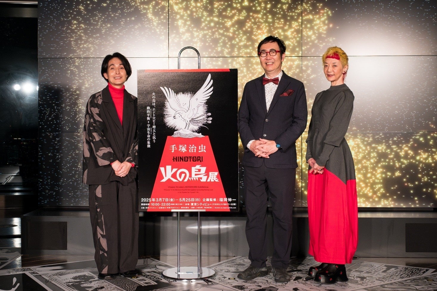 東京シティビュー(六本木ヒルズ森タワー52階)では、2025年3月7日(金)から5月25日(日)まで、手塚治虫「火の鳥」展 -火の鳥は、エントロピー増大と抗う動的平衡(どうてきへいこう)=宇宙生命(コスモゾーン)の象徴-を開催します。開幕に先立ち会場では、オープニングセレモニーが行われました。セレモニーには、手塚治虫作品の大ファンであり、マンガ家でもある矢部太郎さん、手塚治虫先生のご息女である手塚るみ子さん、本展の企画監修者である福岡伸一先生が登場。さらに、セレモニーには新国立劇場で上演されるバレエ作品「火の鳥」で主役の火の鳥を務める小野絢子さんも駆けつけ、本展の開幕を彩りました。