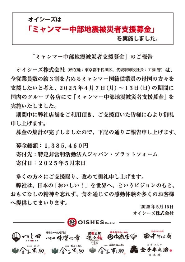オイシーズ、運営店舗にて「ミャンマー中部地震被災者支援募金」の実施を決定