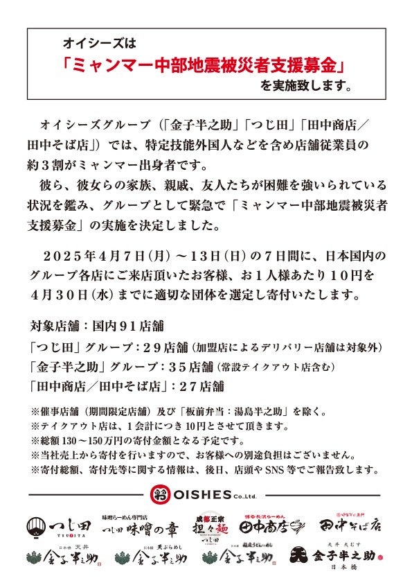 2025年4月7日(月)〜13日(日)の期間、オイシーズ株式会社が運営する「日本橋 天丼 金子半之助」、「つじ田」、「中華そば専門 田中そば店」等で実施