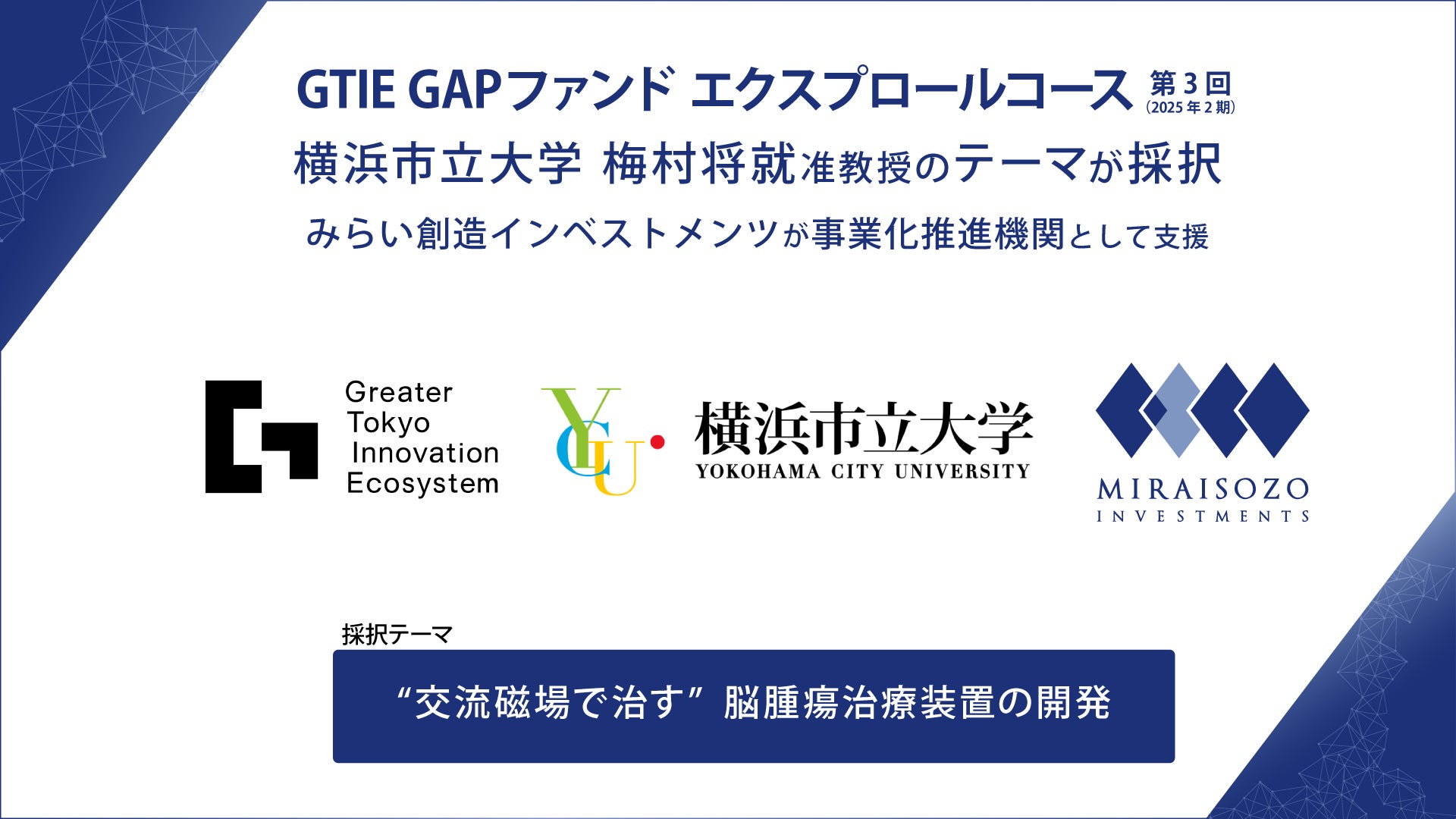 公立大学法人横浜市立大学(学長:石川 義弘) 医学部循環制御医学 梅村将就 准教授らの研究グループの研究テーマ「 “交流磁場で治す”脳腫瘍治療装置の開発」が、科学技術振興機構(JST)「大学発新産業創出基金スタートアップ・エコシステム共創プログラム」採択プログラムの Greater Tokyo Innovation Ecosystem(GTIE)「GTIE GAPファンド エクスプロールコース第3 回(2025年2期)」に採択されました。株式会社みらい創造インベストメンツ(代表取締役社長:岡田 祐之)は本テーマについて事業化推進機関として伴走し、技術の事業化、スタートアップ創業を目指します。