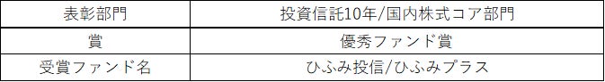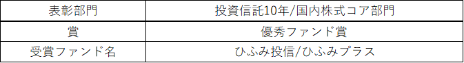 投資信託 10 年部門でひふみ投信は5年連続の受賞(※1)となります。販売会社向けに2012年に運用・販売を開始したひふみプラスは投資信託10年部門で初の受賞となります。当社は今回の受賞を励みとして、更なる運用成績の向上と質の高いサービスで、「ひふみ」シリーズを通じてお客様の資産形成を長期にわたって応援できるよう努めてまいります。