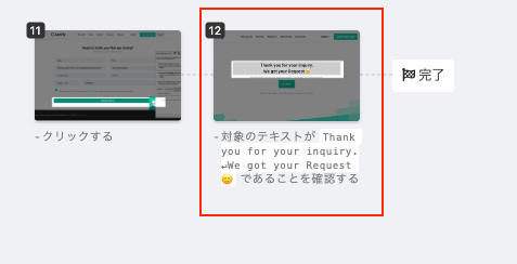 このシナリオは、Autifyのデモリクエストフォームの動作をテストします。ユーザーがhttps://autify.com/にアクセスし、必要な情報(名前、メール、会社名など)を入力してから「Request Demo」ボタンをクリックする流れを試験します。最も重要なアサーションはすべての入力と操作後に、「Thank you for your inquiry.We got your Request」のメッセージが表示されることです。これにより、ユーザーのデモリクエストが正しく送信されたことを確認します。