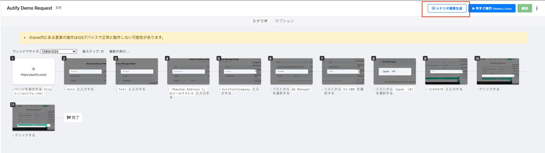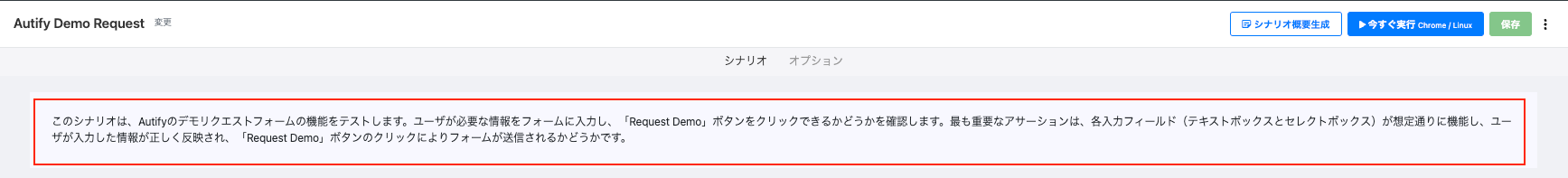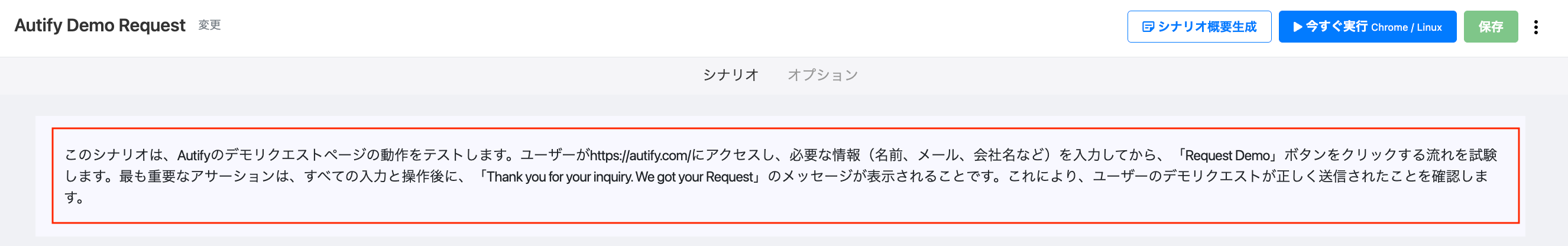 また、本機能はシナリオが編集された場合、シナリオ概要も編集内容に合わせて変更されます。実際に、先ほどのオーティファイのデモリクエストを行うテストシナリオに、完了画面で表示される文言の確認を追加した場合、下記のように概要も変更されます。