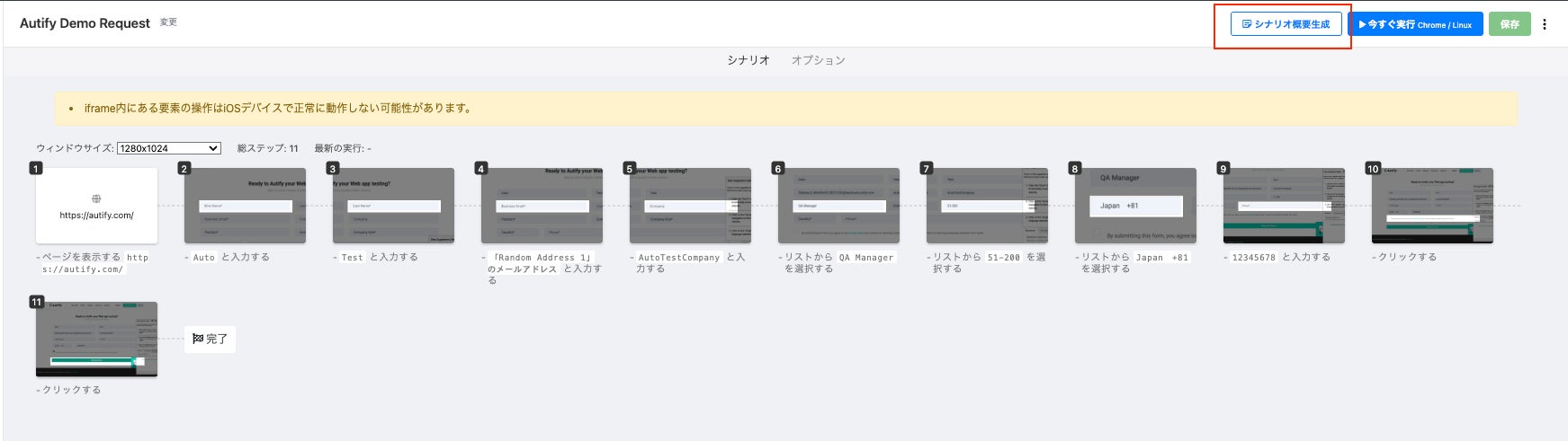オーティファイが提供する「Scenario Summarizer」はChromeの拡張機能として提供しています。この拡張機能をインストールした状態で、テストシナリオの編集ページを開くと「シナリオ概要生成」というボタンが表示されます。