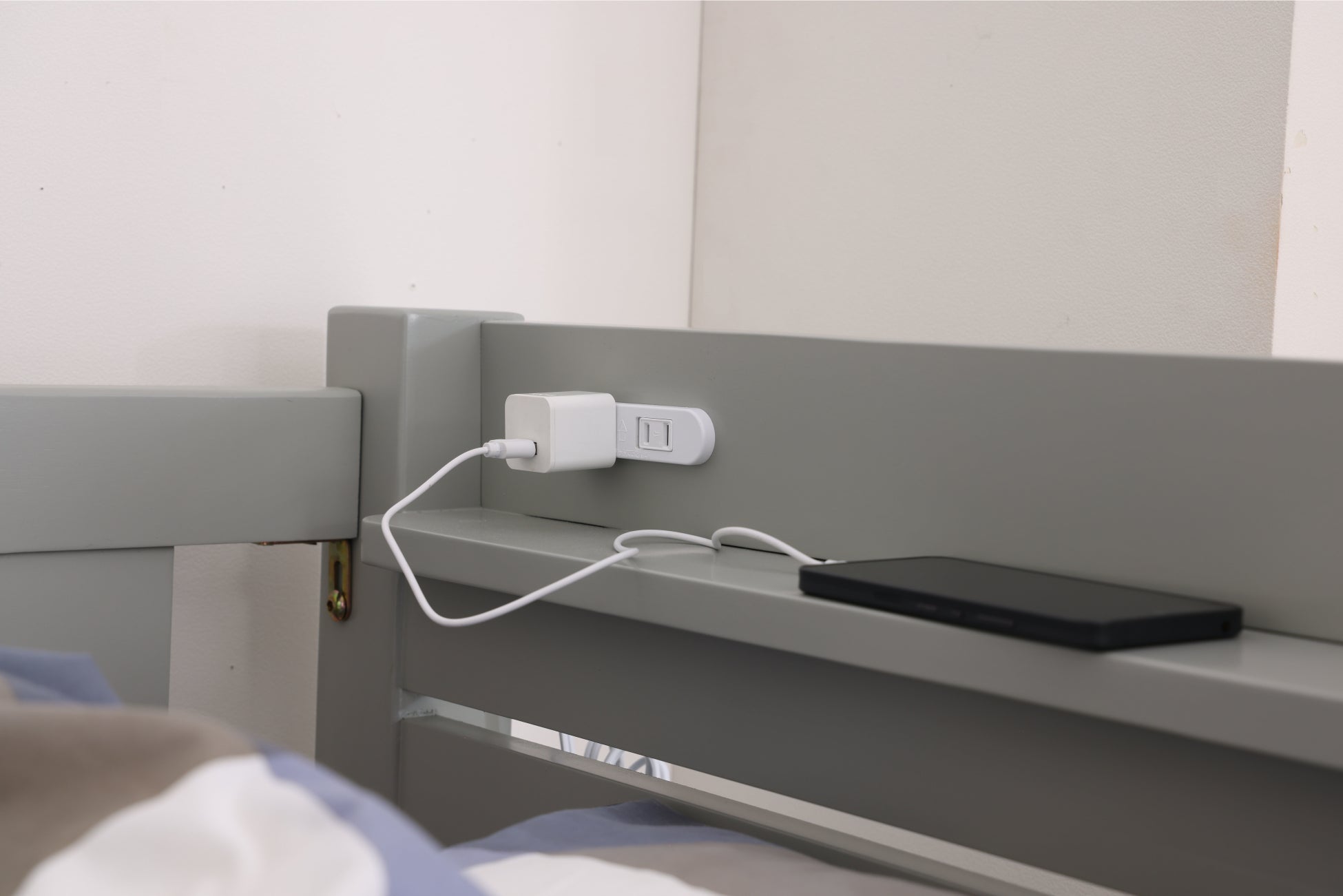 上段・下段ともにヘッド部分が2口コンセント付きの宮タイプになっています。スマートフォン等を置けるくらいのちょっとしたスペースがあり、充電も可能です。さらにフット部分の上段には長方形のスチールプレートを設置。マグネット付きのフックや収納グッズなど使用できるため、さまざまな活用ができます。