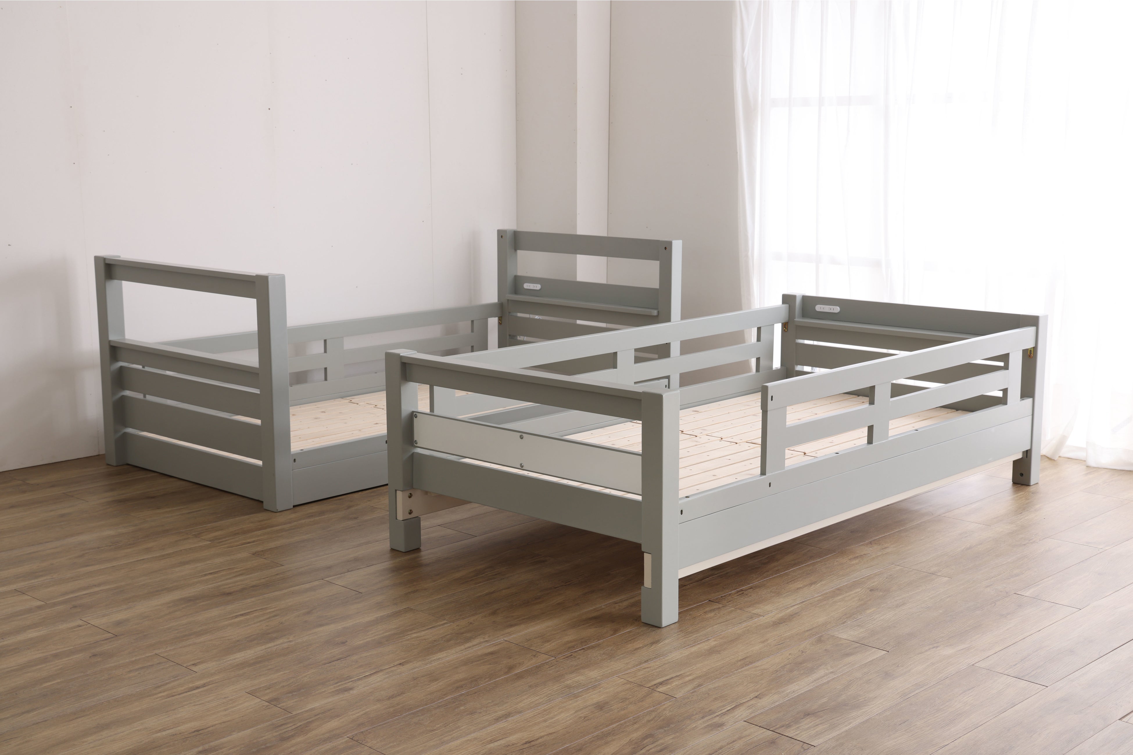 幅と奥行きは一般的な二段ベッドと同じサイズですが、1段目のベッドを低床(ローベッド)にすることにより、2段重ねている状態でも、138cmと極限まで高さを抑えています