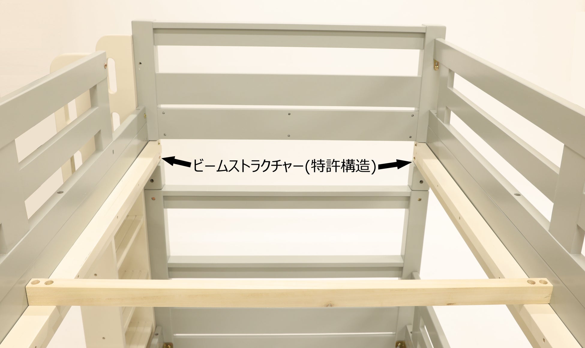 日本の建築技法、梁構造を応用しています。梁(はり、りょう)は水平方向に架けられ、床や屋根などの荷重を柱に伝えます。柱を支える構造上重要な部材でビームとも呼ばれています。この技法を取り入れ、通常は2本の桟で荷重を支えるところを、さらに両サイドにツインビームプロテクターを装着して合計4本の桟で上からの荷重を支えることより、静止荷重500kg以上のクリアを実現しました。