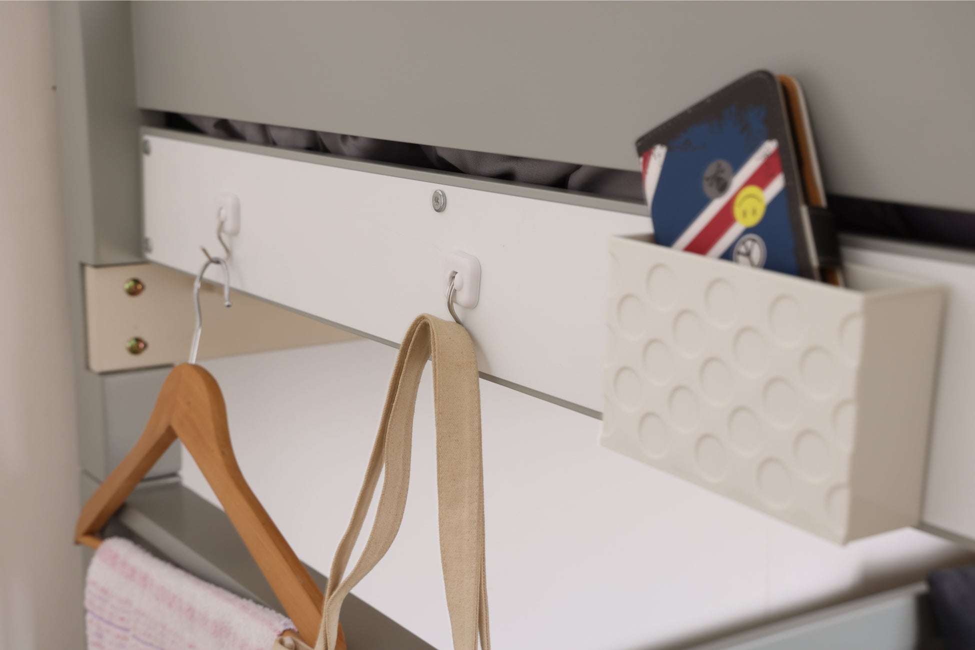 グレーをベースにした配色で、ベッド本体は、PGY(ペールグレー)、WGY(ウォームグレー)、CGY(クラウドグレー)の3色でラインナップ。梯子(はしご)とビームストラクチャー部分は、IV(アイボリー)のツートンカラーのデザイン。落ち着いた上品な雰囲気でお部屋に合わせやすくなっています。