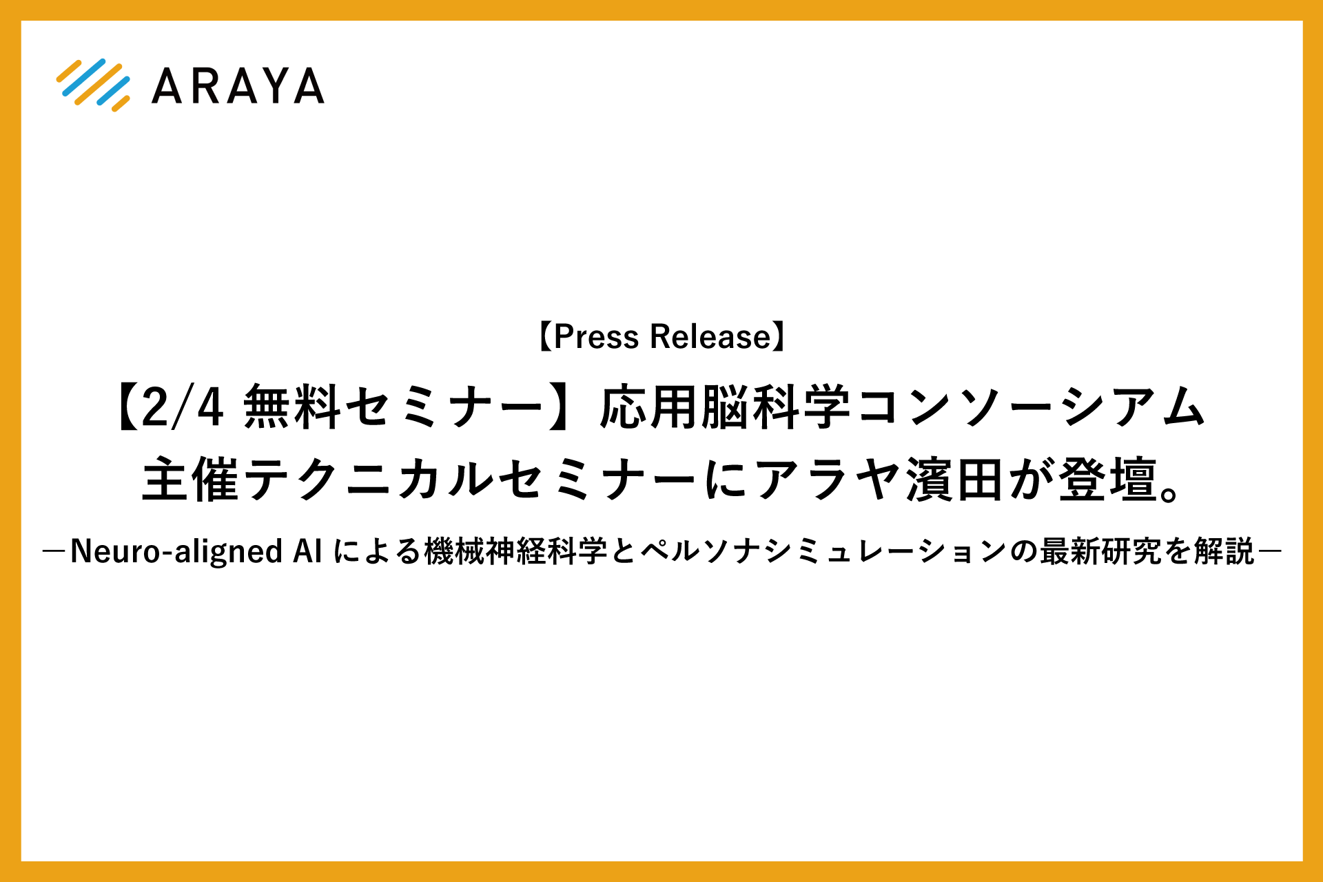 株式会社アラヤ(所在地:東京都千代田区、代表取締役:金井良太、以下「アラヤ」)NeuroAI事業部 ペルソナラボチームリーダー 濱田太陽が、2026年2月4日(水)に開催される応用脳科学コンソーシアム主催のFY2025テクニカルセミナーに登壇します。本登壇では、AIシステムを脳の表象・ダイナミクス・人間行動と整合させる「Neuro-aligned AI」の概念を紹介し、現代のAIシステムを神経科学的手法で解剖・解釈する新しいアプローチと、ペルソナシミュレーターによるデジタルツイン応用について解説します。