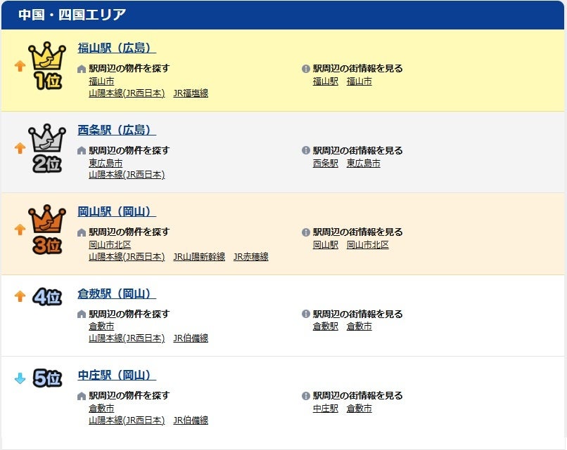 1位の福山駅は7位からのランクイン。2位の西条駅は4位からのランクアップ!