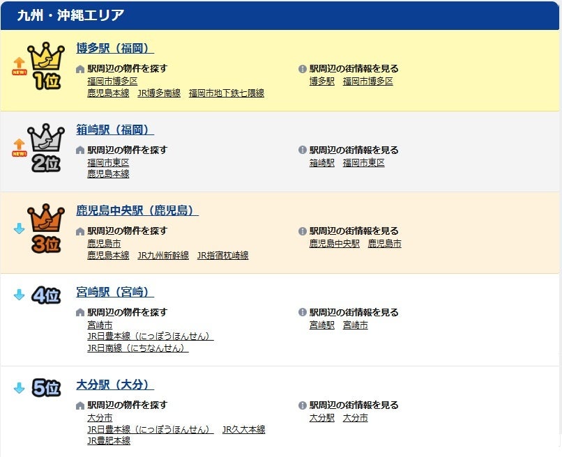 1位の博多駅はランク外からの堂々の1位へ。2位の箱崎駅もランク外からのランクイン。