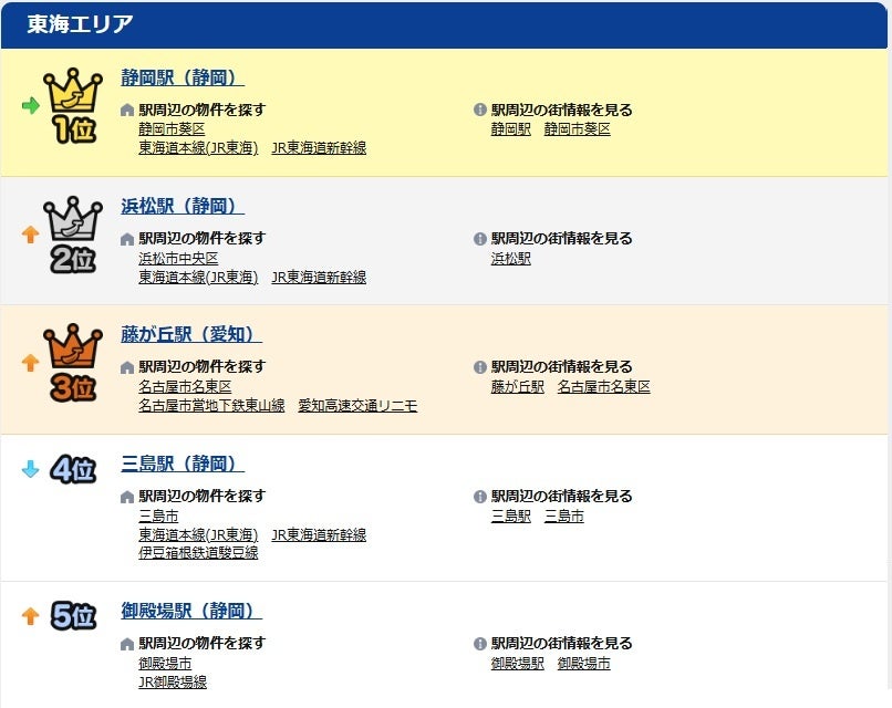 静岡の静岡駅が連続1位、2位の浜松駅は3位からのランクアップ。
