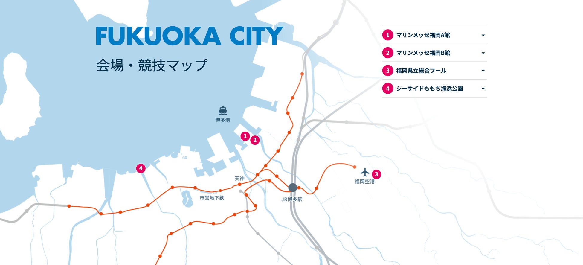 ①マリンメッセ福岡A館(競泳、アーティスティックスイミング)