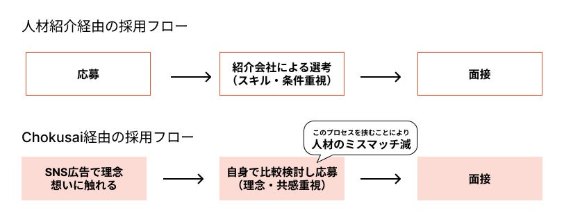 ・ミスマッチ: 人材紹介会社経由ではスキルや条件が優先され、最も大切にしている「理念」や「カルチャー」が候補者に十分に伝わらない。紹介を受けても採用決定に至らないケースが多発していた。