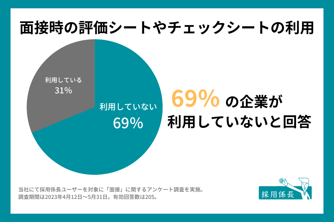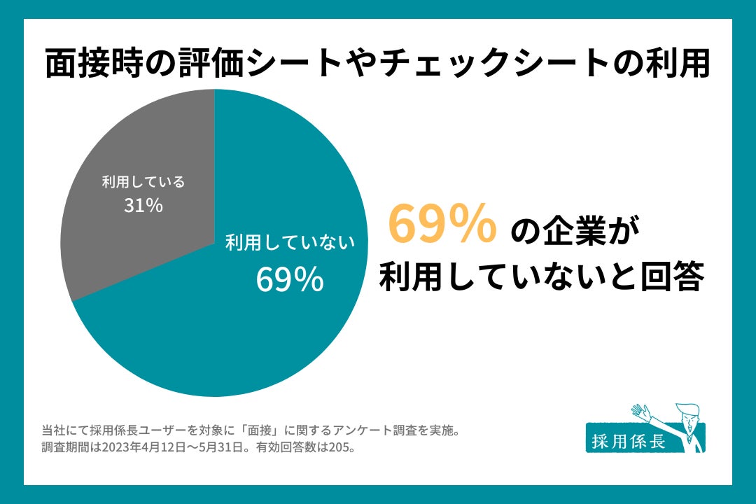 当社で採用係長ユーザーを対象にアンケート調査(※1)を実施しました。その結果、「面接時、評価シートやチェックシートを利用していますか?」という質問に対し、「はい」という回答が31.2%、「いいえ」が68.8%と、6割以上が面接にあたって決まったフォーマットや記録シートを利用していないことが分かりました。